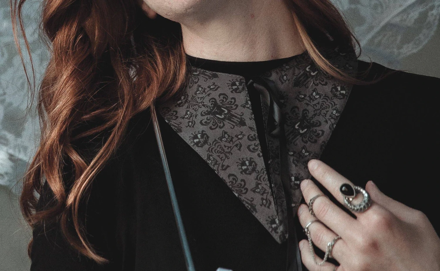 Foolish Mortals Collar This detachable & reversible collar is an accessory to accompany all Haunted Mansion-inspired looks. Adjustable, to be tied to fit you best, with a black satin ribbon front closure.  Sizing: Neck size: 35cm. Collar is slightly adjustable with the ribbon closure. Please keep this sizing in mind when purchasing your collar. Reversible Design: ‘Foolish Mortal’ design on front (eyes glow in the dark very subtly), solid grey on the back. Material: Soft & Cozy Mercerized Cotton Ribbon: Black Satin Treatment: Machine washable, but it is recommended to hand wash to keep color and fabric at full vibrancy.