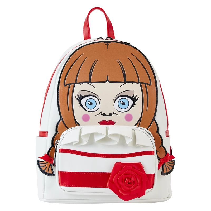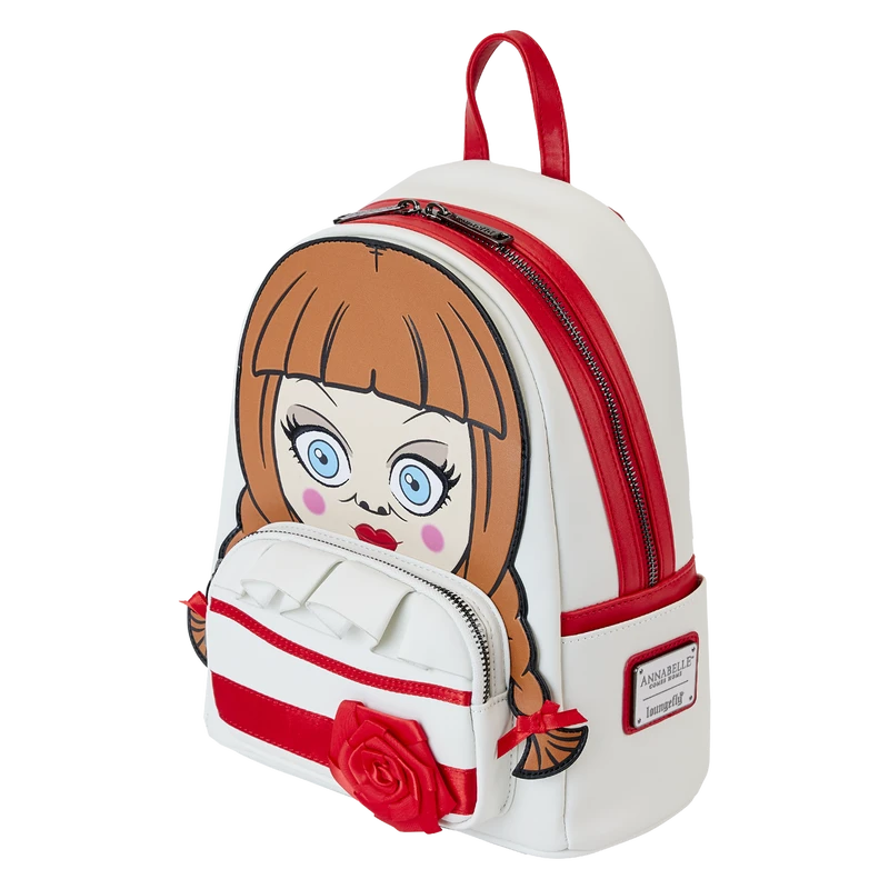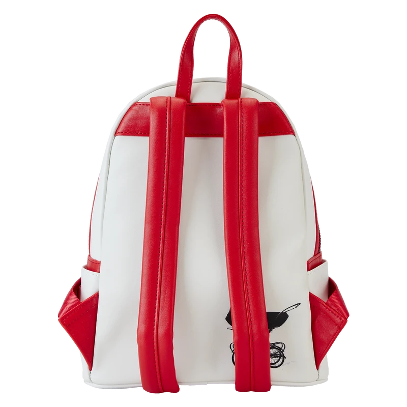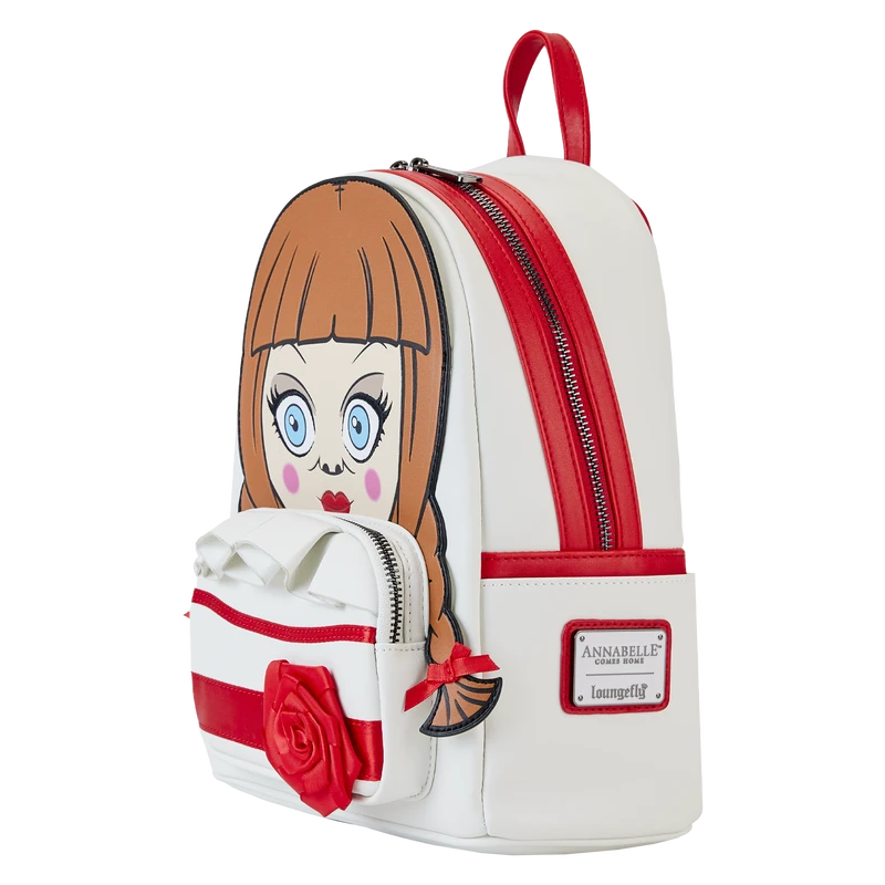 Guess who’s out and about! Doll up your wardrobe with our Loungefly Annabelle Cosplay Mini Backpack. This hauntingly fashionable accessory features an applique of Annabelle’s head, rising up over the top edge of the backpack. Real bow ribbons are fastened to her braided pigtails, and shiny red satin ribbon details complement the white background of her dress. A ruffle applique over the front pocket adds an authentic touch, and a 3D red faux satin rose completes the look. On the back, you’ll find a printed image of a baby carriage. Conjure up plenty of adventures with this wickedly fun accessory.