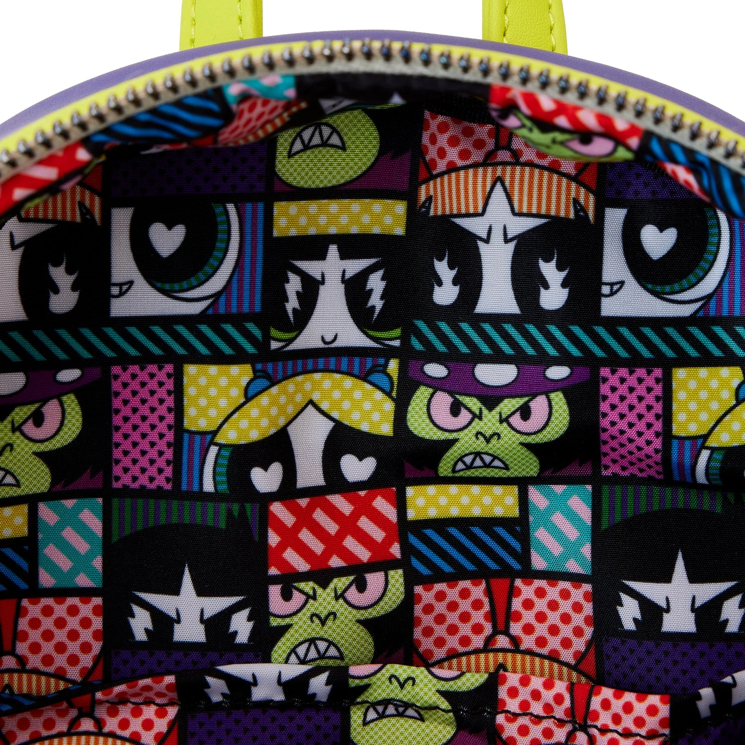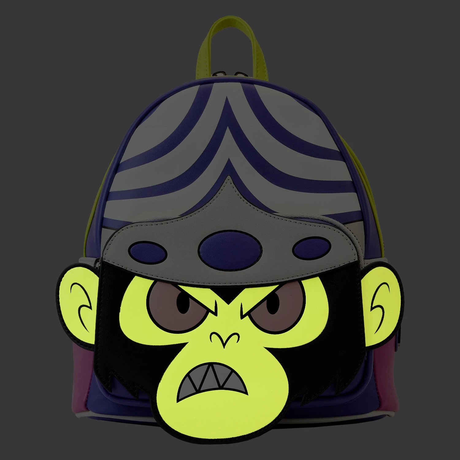 The Loungefly Powerpuff Girls Mojo Jojo Cosplay Mini Backpack is made of vegan leather (polyurethane). Bag has adjustable shoulder straps and shiny silver hardware. Additional features include applique, debossed, embroidered, glow-in-the-dark, and printed details. Take note of the coordinating inside lining.
