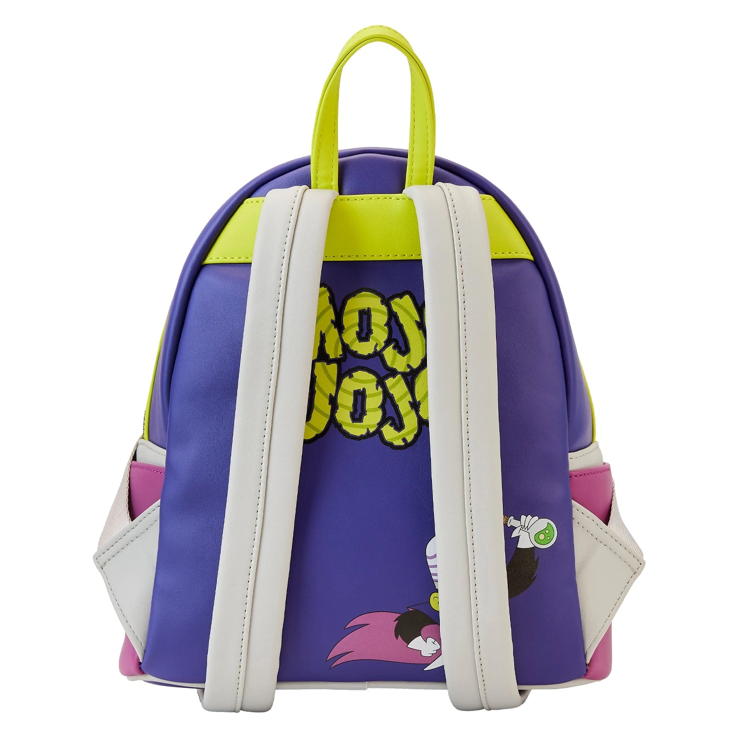 The city of Townsville is under attack! Notorious villain Mojo Jojo takes shape on the Loungefly Powerpuff Girls Mojo Jojo Cosplay Mini Backpack. On the front, Mojo’s signature scowl appears on the zipper pocket while his helmet appears above. An enamel zipper charm of a ray gun appears nearby, and his face gives off a radioactive glow as day turns to night. On the back, Mojo Jojo holds a green chemical in victory as his name appears above. An outrageous addition to any outfit, this accessory will keep your secret plans safe as you plot to take over the world.