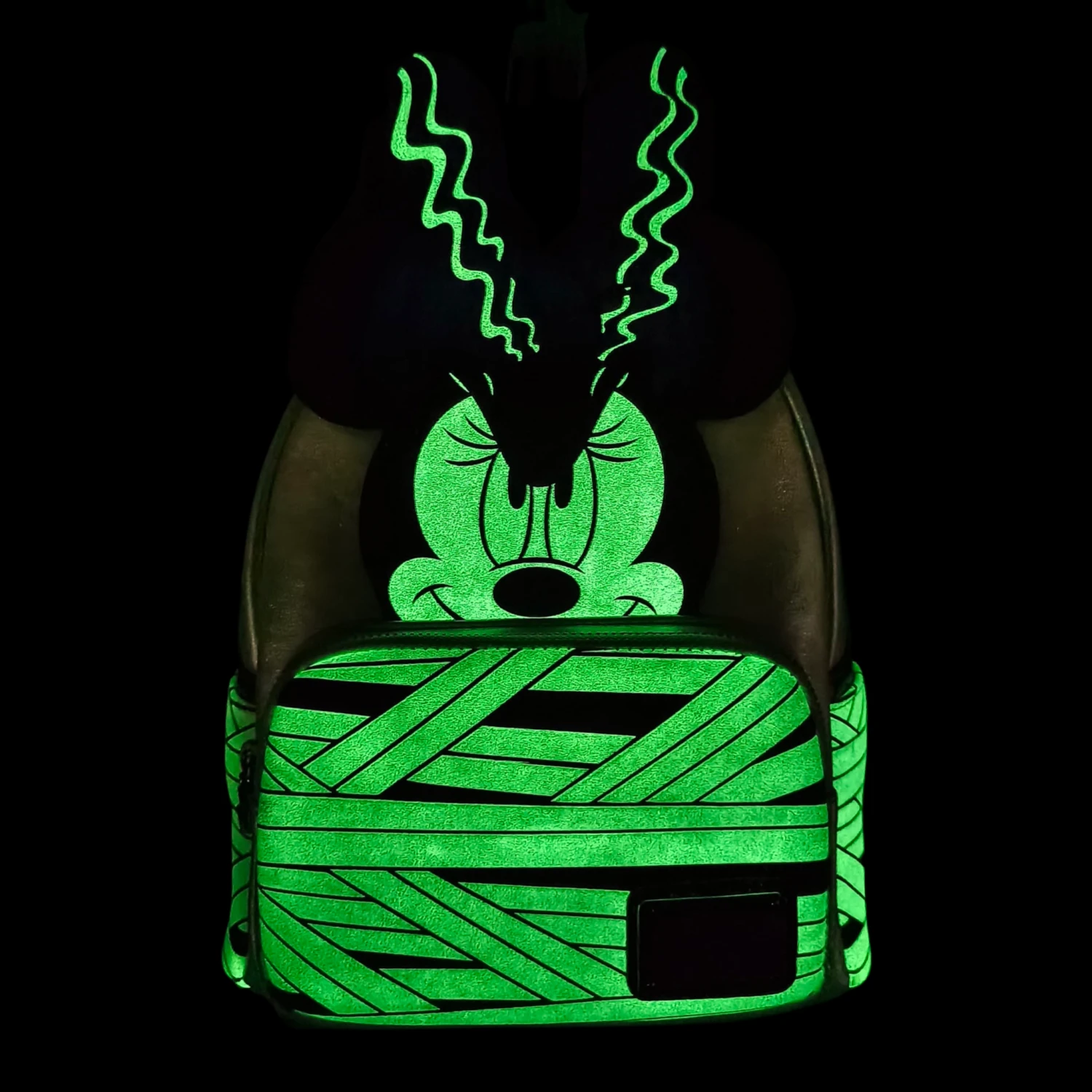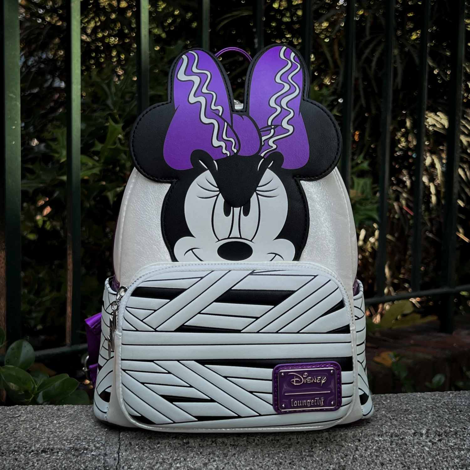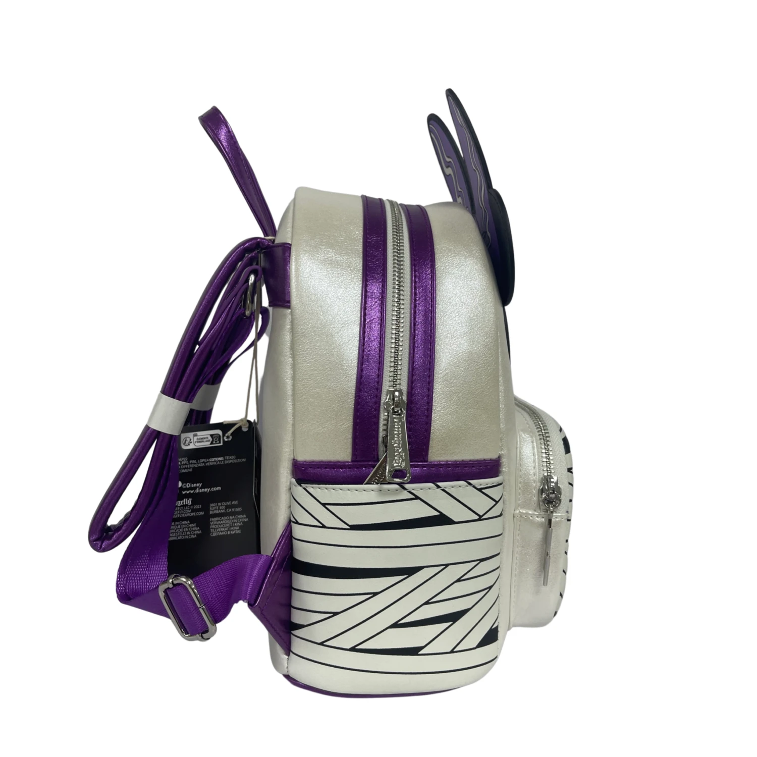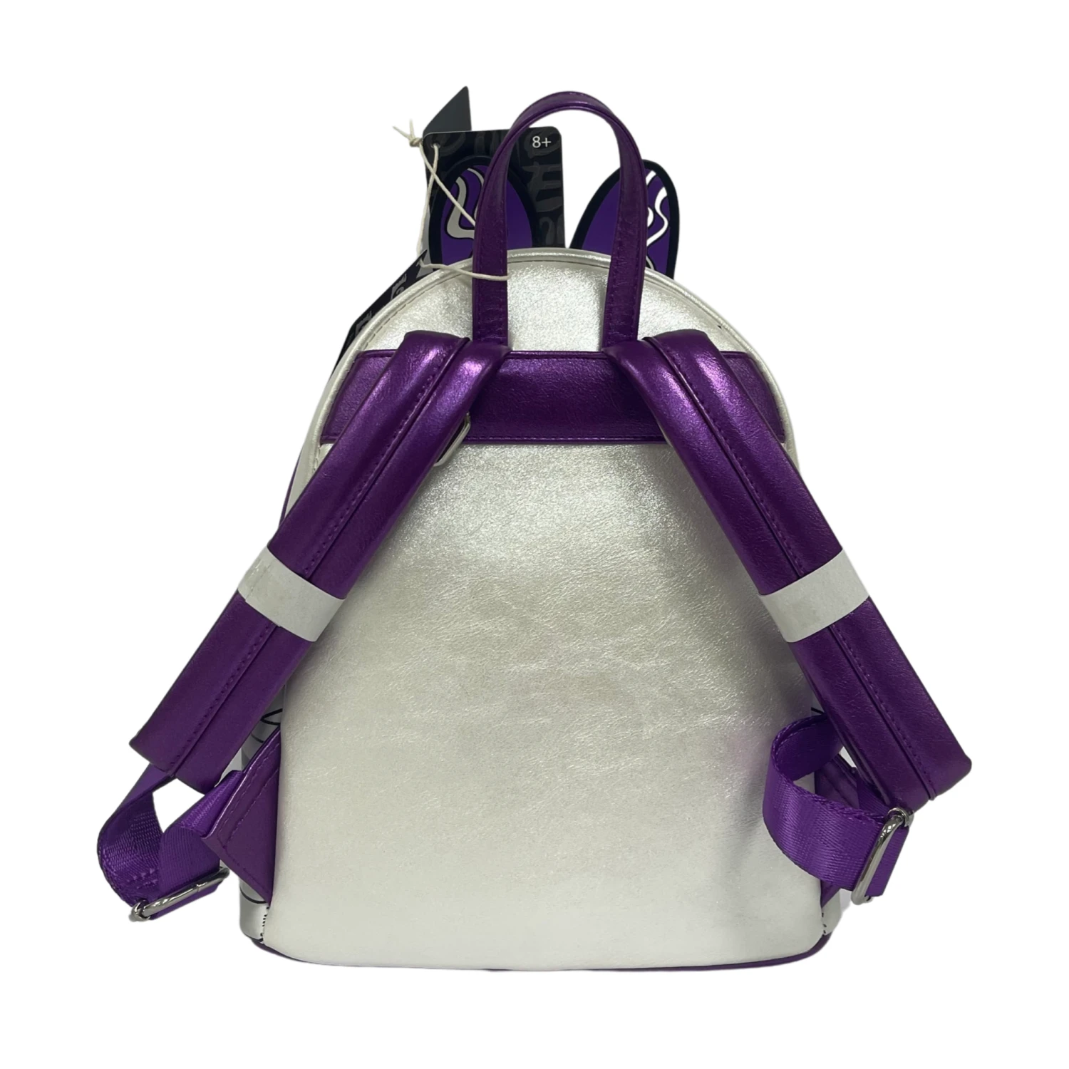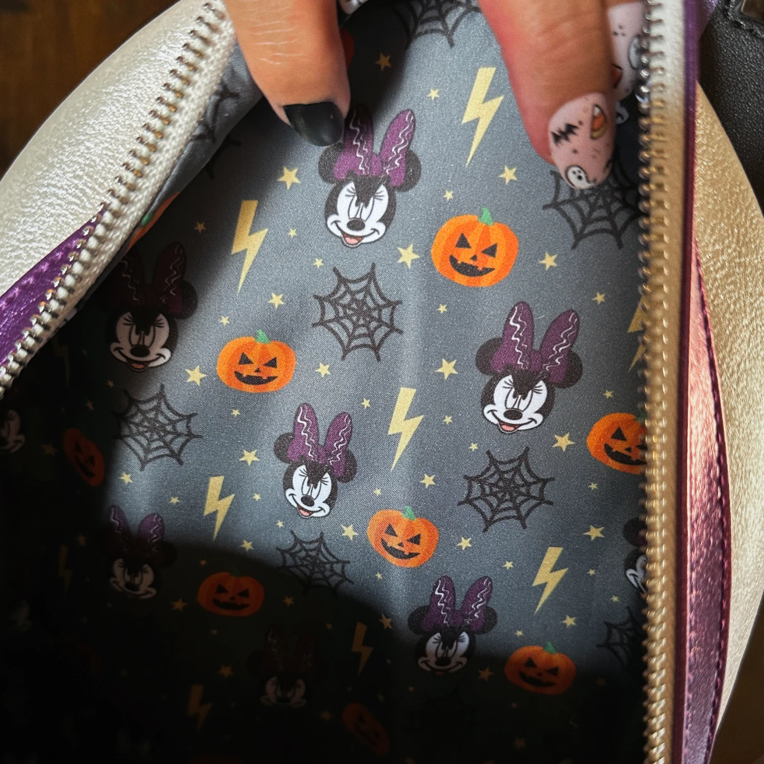 She’s Alive… Our Loungefly Disney Bride of Frankenstein Mini Backpack is a boooo-tiful pearlescent shimmer Faux leather mini backpack. Her bow has the iconic lightning streaks as well as a lightning bolt zipper charm. She has lots of glow and beautiful metallic purple trim and padded straps. Fun printed matching AOP lining. She has a inside zip pocket and there are also sided pockets.