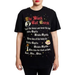 Invoke the power of the Sanderson Sisters with the Loungefly Hocus Pocus Binx Curse Tee. This super soft tee shirt outlines the Black Cat Curse that was used to transform Thackery Binx into his cat form. Written in a script inspired by the Sanderson Sisters’ spell book, the shirt reads: “Twist the bones and break the back. Ichita Copita Melaka Mystika, Trim him of his baby fat. Itchita Copita Melaka Mystica, Give him fur black as black. Just… Like… This.”