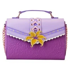 Time to gleam and shine! Our Loungefly Disney Tangled Rapunzel Cosplay Magic Flower Crossbody Bag is filled with elegant details. On the front, you’ll find the Magic Flower enamel-filled rivet clasp. The crisscross details of Rapunzel’s bodice carry out in ribbon and applique detail on the front flap as well. A gold band motif of Pascal lines the front flap below, along with an applique white scalloped decoration. Complementing the violet color of the flap, a darker purple color, with motifs of debossed floral elements carries through to the back. The classic lines of this accessory’s silhouette are timeless. Spark magic wherever you go with this charming accessory.