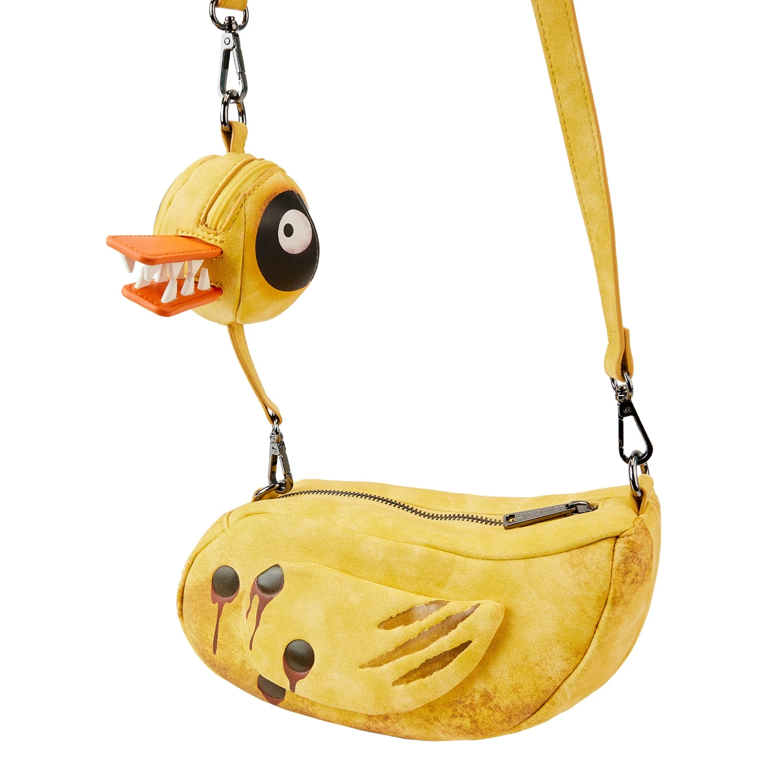The Loungefly Nightmare Before Christmas Toy Undead Duck Crossbody Bag is made of vegan leather (polyurethane). Bag has adjustable (detachable) shoulder strap and gunmetal-colored hardware. Additional features include applique, debossed, and printed details. Take note of the coordinating inside lining.