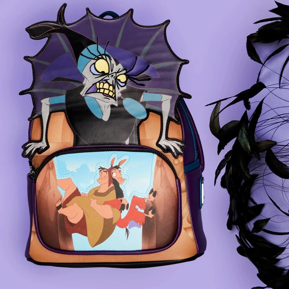 A furious storm has cast Yzma into a rage as she struggles to rescue the potion that will turn Kuzko back into a human. Contain her wrath with this The Emperor’s New Groove Yzma Villains Scene Mini Backpack. On the front of the backpack, Yzma comes to life in applique detail, glaring down and over the image on the front zipped compartment of Kuzko and Pacha, climbing together between narrow cliffs, escaping with the potion. On the back, Yzma poses as a triumphant cat who momentarily manages to capture the potion. In fact, an enamel zipper charm of the potion, in glitter detail, completes the scene. This backpack is a great accessory for any Disney outfit.