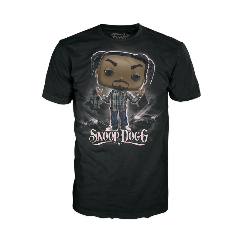 Listen to your favorite tunes in comfort and style with this Snoop Dogg Pop! Tee. On the front of this short-sleeved tee, iconic rap star, Snoop Dogg, takes the stage, illuminated by spotlights. This exclusive, black, crew neck tee is perfect for showing off your Pop! Rocks pride in your collection and on the go!