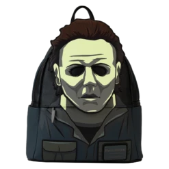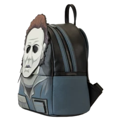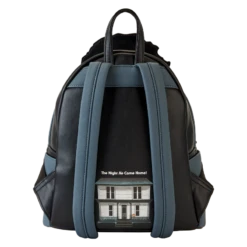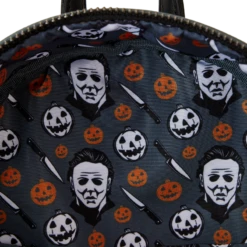 Cue the haunting theme song and look sharp! Make an entrance with our Loungefly Michael Myers Halloween Cosplay Mini Backpack. Michael Myers’ eerie, masked face comes to life in applique detail, rising up over the top edge of the backpack. In the dark, the entire face glows! The front zipped pocket features applique shirt pockets and a collar. A metal zipper charm, in the shape of a knife, is a pointed nod to the legacy of this slasher film. On the back, you’ll find the famous house setting for this classic Halloween movie, along with the words, “The Night He Came Home”—and they glow in the dark! Pack just what you need to enjoy a night of fun watching scary movies at friends’ houses—or simply visit your favorite haunts in style.
