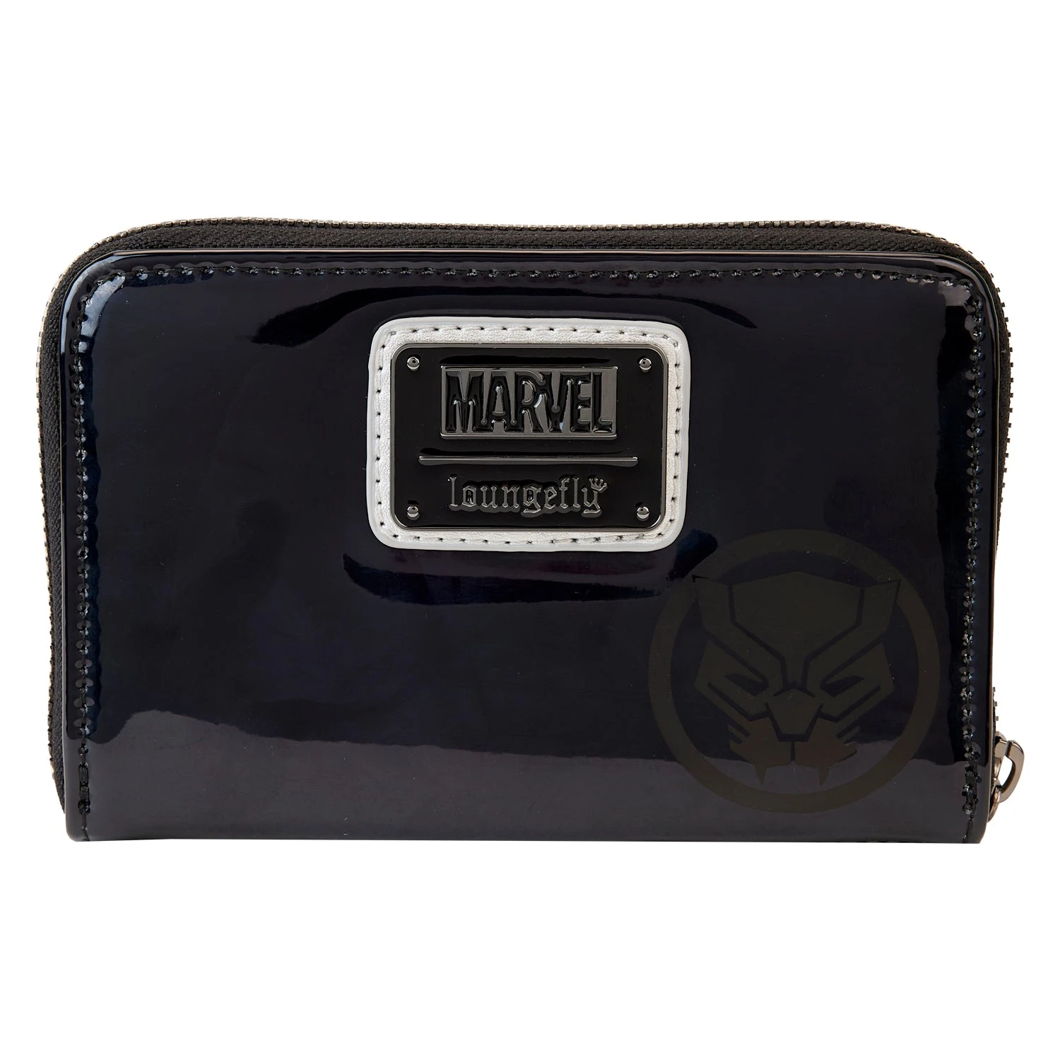 The Loungefly Marvel Metallic Black Panther Cosplay Zip Around Wallet is made of vegan leather (polyurethane). Wallet zips closed with gunmetal-colored hardware. Additional features include applique, debossed, glitter, and printed details. Take note of the coordinating inside lining.