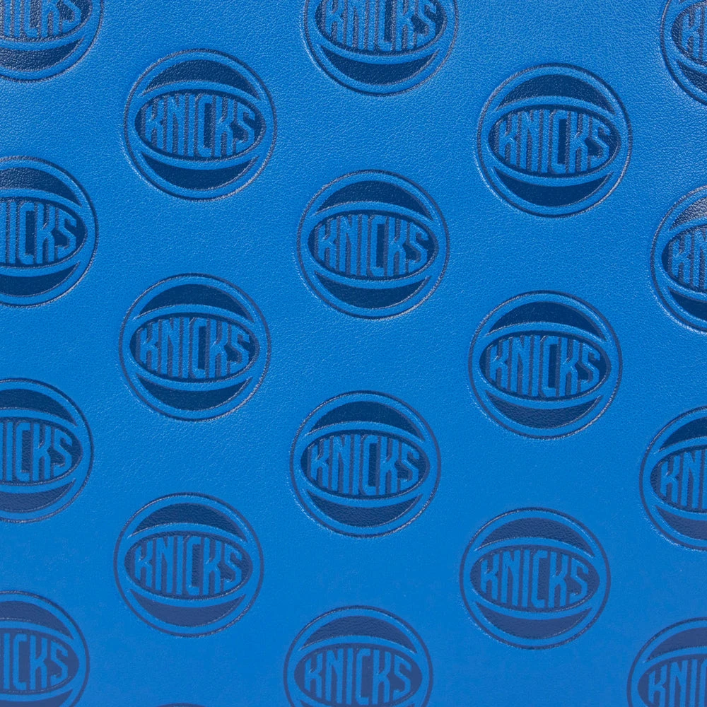 Bring the court to session with this NBA New York Knicks Logo Mini Backpack. The Knicks’ embroidered logo, anchored by a basketball and triangle background with 3D-effect lettering, prominently appears above the front zipped compartment. A blue background carries a debossed motif of another logo, which shows the word “Knicks” running through the center of a basketball. Orange trim adds accent and contrast in team uniform color.