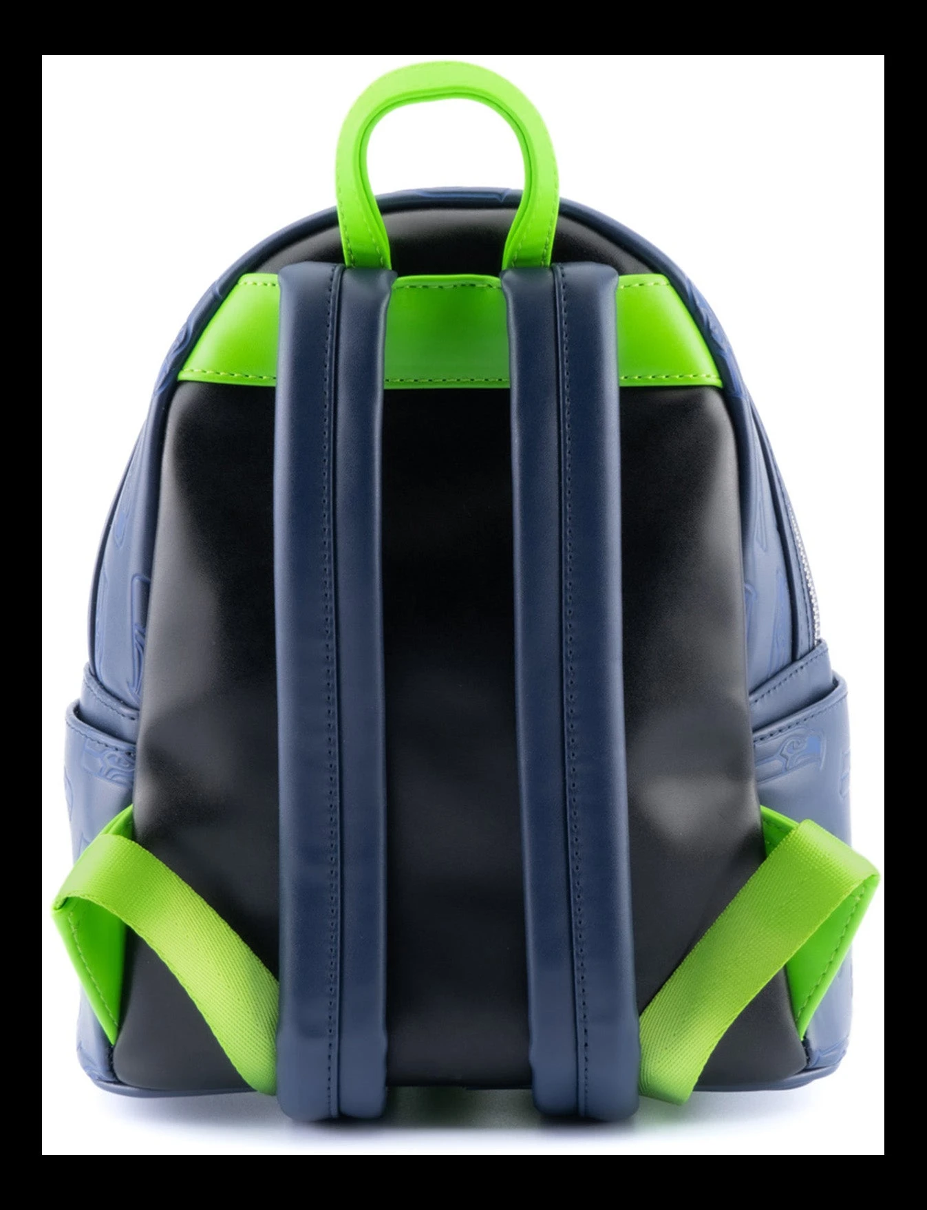 The NFL Seattle Seahawks Logo Mini Backpack is made of vegan leather (polyurethane). Bag has adjustable shoulder straps, sturdy metal hardware, and features: embroidered patch, debossed, and printed details. Take note of the coordinating pattern of the inside lining fabric.