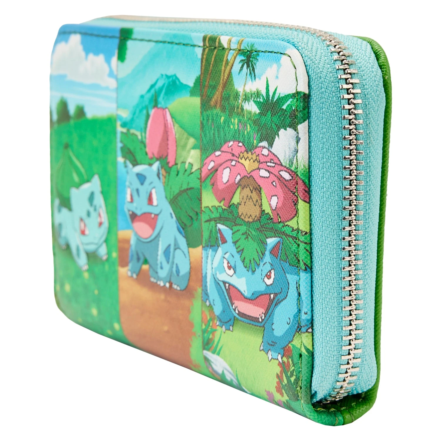 The Loungefly Pokémon Bulbasaur Evolution Zip Around Wallet is made of vegan leather (polyurethane). Wallet zips closed with sturdy metal hardware. Additional features include debossed and printed details. Take note of the coordinated inside lining.