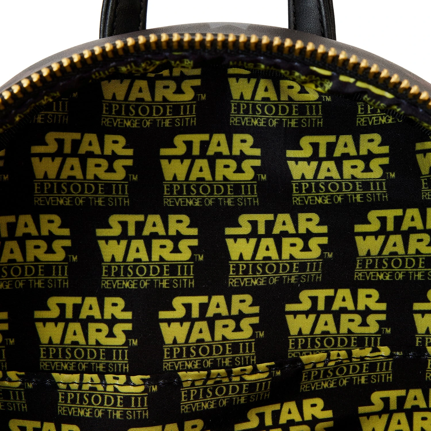 The Loungefly Star Wars: Episode III – Revenge of the Sith Scene Mini Backpack is made of vegan leather (polyurethane). Bag has adjustable shoulder straps, sturdy metal hardware, and features printed details. Take note of the coordinating inside lining.