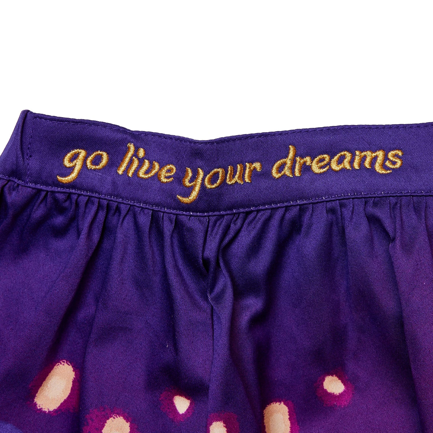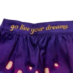 Light the lanterns and make a grand entrance in our Stitch Shoppe Disney Story of Rapunzel Sandy Skirt! Rapunzel’s entire story plays out on the pleats of this elegant skirt. Mother Gothel combs through Rapunzel’s golden tresses, lanterns float overhead above the castle, and a gondola, with Flynn Rider and Rapunzel, passes by. Intricate details of birds, the magical flower, and the sun float along the hem of this soft purple and pink skirt. On the waistband, gold embroidery spells out, “Go live your dreams.” It’s perfect for catching the fireworks at the end of the night—or for turning everyday moments into enchanting adventures.