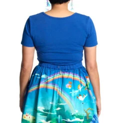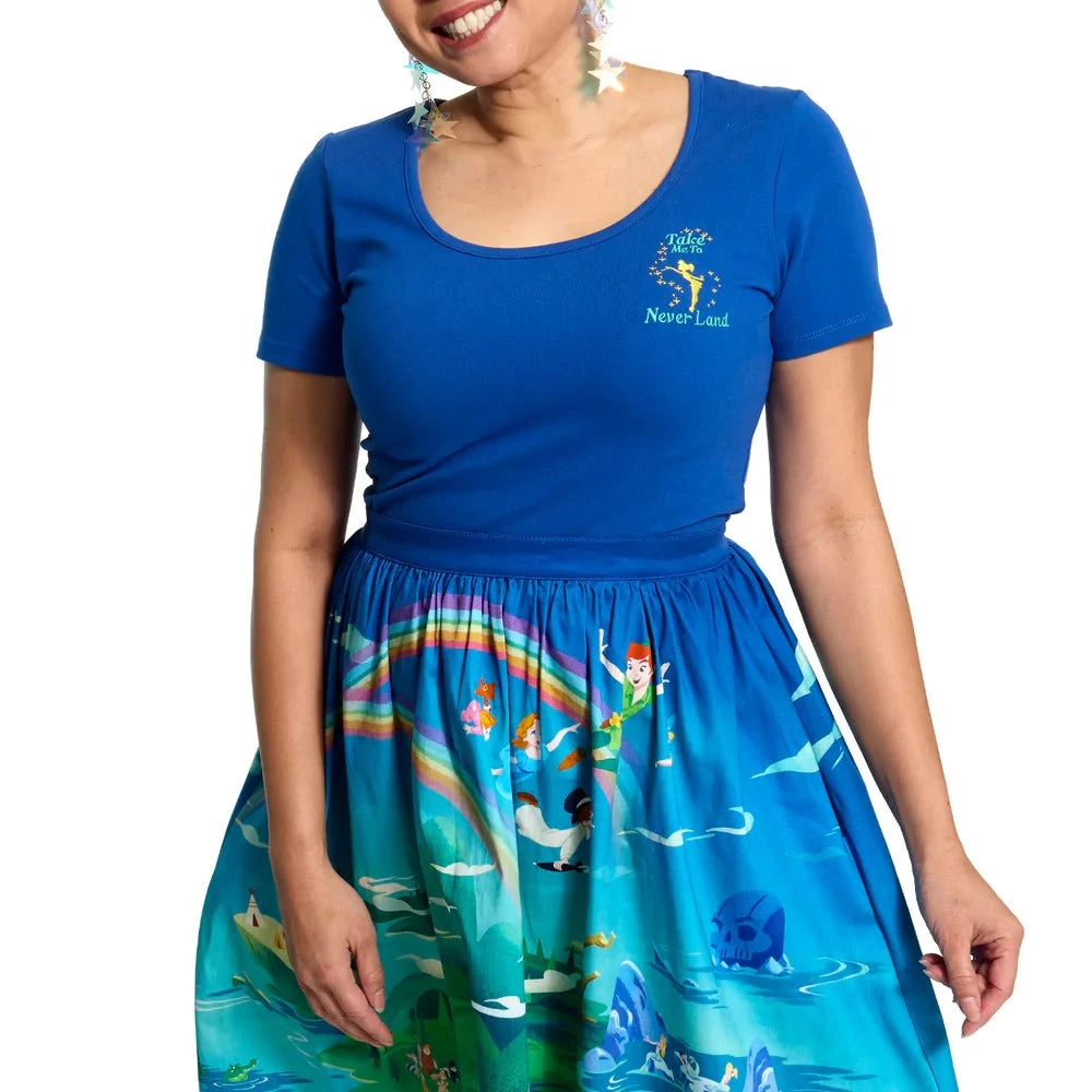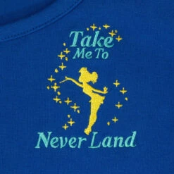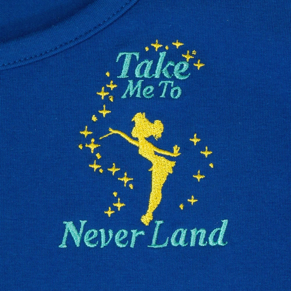 Dress the part for adventure! Soar to the second star to the right with the Stitch Shoppe Peter Pan Tinker Bell “Kelly” Top. This blue scoop neck shirt features an embroidered Tinker Bell as she sprinkles pixie dust near the shirt’s collar. The phrase “take me to Never Land” appears nearby, inspiring dreamy visions of Peter Pan and Tinker Bell’s stellar hideaway. Easily paired with a variety of skirts and bottoms, this versatile shirt creates the perfect Disney-themed outfit for any occasion.