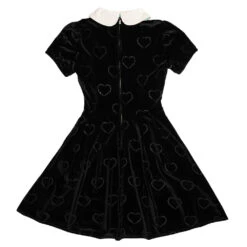 This Alicia style dress is made of a super soft embossed velvet and features embroidered details, and an elasticized back for custom fit. This versatile dress can be layered up with cute sweaters and coats during cooler temperatures. It also features a sturdy back zipper and has pockets. This dress also comes with a matching Bride of Frankenstein Heart enamel pin which is approximately 1.5-inches tall. This dress is officially licensed by Universal Monsters.Â