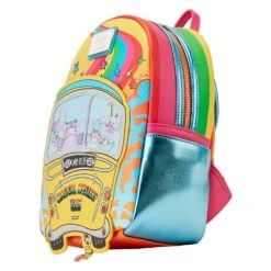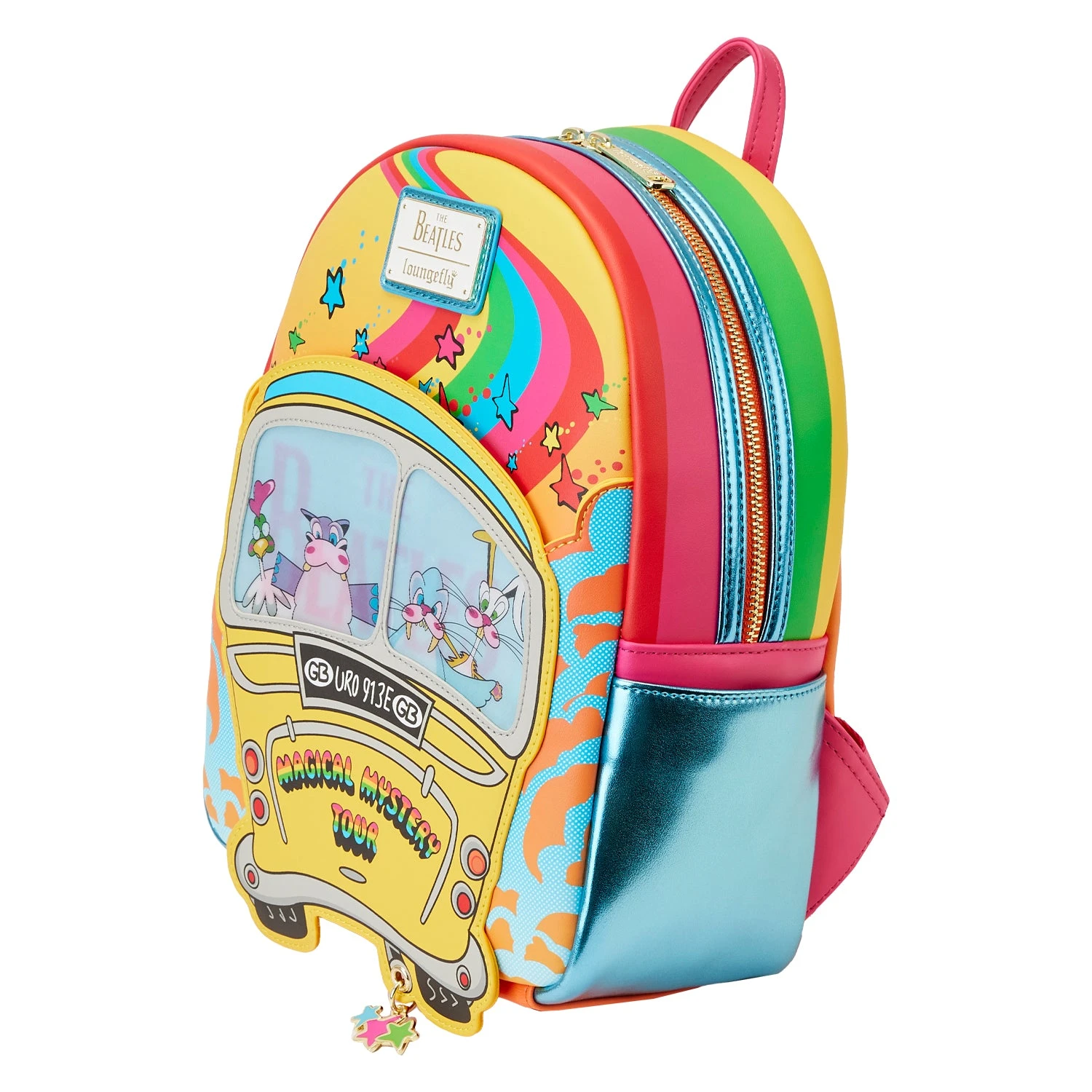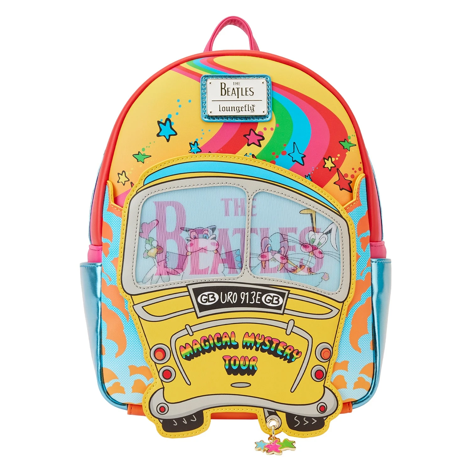 The Loungefly The Beatles Magical Mystery Tour Bus Mini Backpack is made of vegan leather (polyurethane). Bag has adjustable shoulder straps and shiny gold hardware. Additional features include applique, embossed, lenticular, and printed details. Take note of the coordinating inside lining.