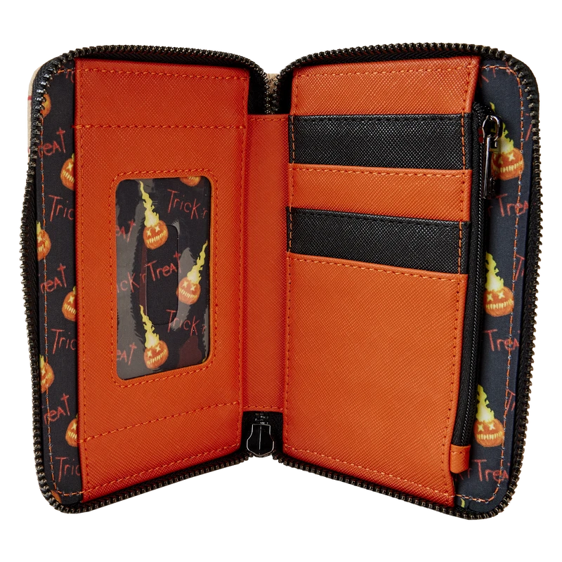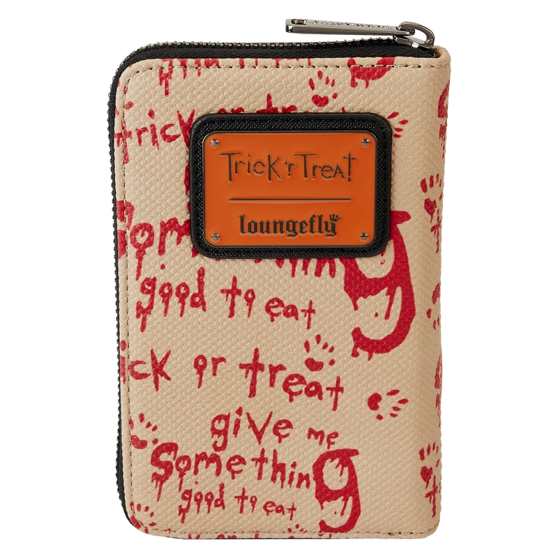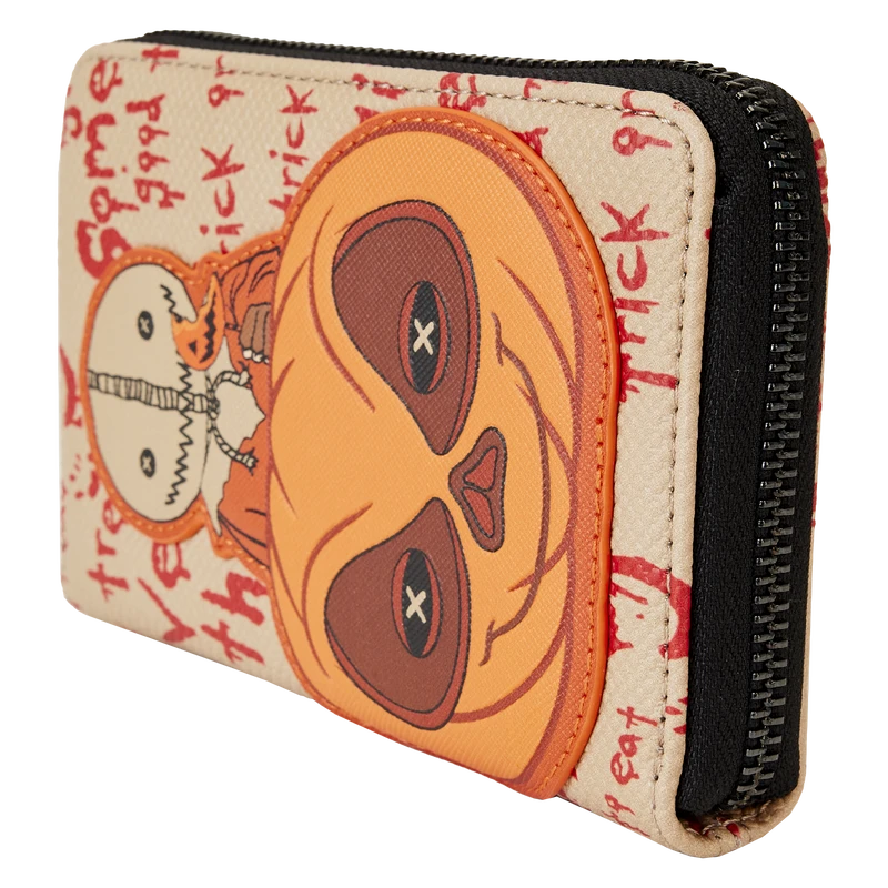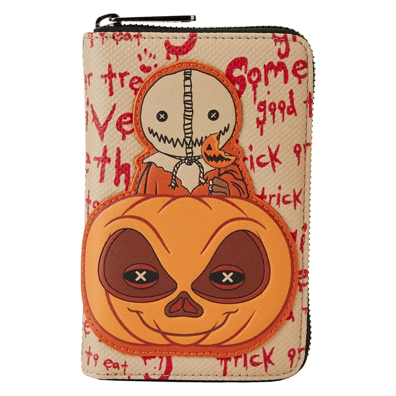 Sharpen your look with a sweet accessory. Our Loungefly Trick âr Treat Pumpkin Cosplay Zip-Around Wallet is ready for some fun. On the front of this wallet, Sam pops up over a bright orange, devilish-looking pumpkin, and heâs holding a half-eaten jack-oâ-lantern lollipop. Behind him, âdrippingâ red letters spell out, âTrick or treat. Give me something good to eatâ in a motif that carries over to the reverse side. Inside, youâll find 4 slots for holding cards and 1 clear slot for displaying your ID. Secure your valuables while enforcing the rules of Halloween in styleâor simply visit your favorite haunts in character.