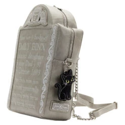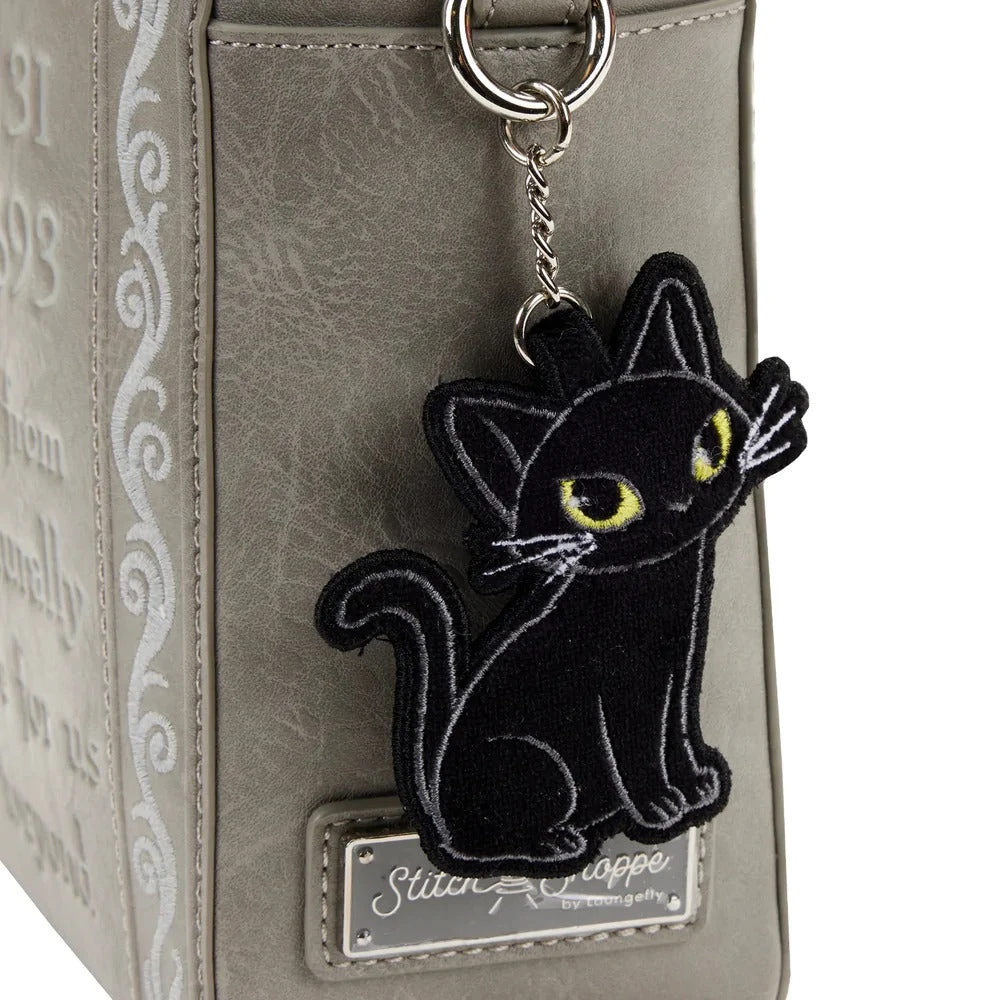 Celebrate the power of All Hallows’ Eve with the exclusive Disney Stitch Shoppe by Loungefly Hocus Pocus Here Lies Emily Binx Convertible Crossbody Bag. This interchangeable accessory forms of the headstone of Emily Binx, the late sister of Thackery. On the front, an engraved epitaph glows in the dark as it describes Emily’s early fate from the wicked Sanderson Sisters. Glow-in-the-dark embroidery highlights the grave’s details, and Thackery Binx appears nearby as a velvet bag charm to guard his sister’s spirit.
